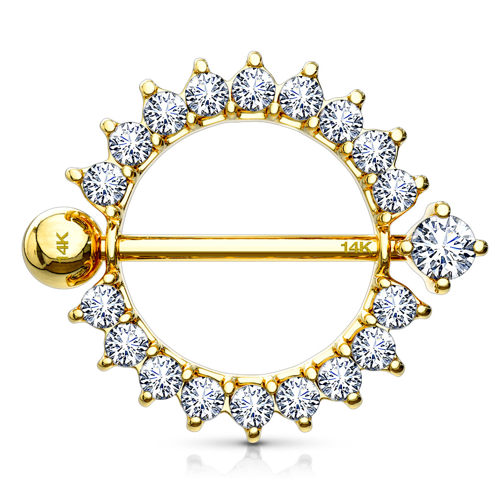 Kas sa trambid jalgu ning karjud täiest kõrist soovist saada eksklusiivne nibuneet? Sel juhul sul on võimalus ehida end nibuneediga, mis on tehtud ehtsast 14-karaadisest kullast ning mille äärt kaunistavad klaarid kivikesed. See on kujundatud nii, et see näeks välja nagu väike päike tänu pisikestele kivikestele, millest igaüks eredalt särab. Iga kivike on sängitatud otse metallbaasi, seega nad ei ole külge liimitud.