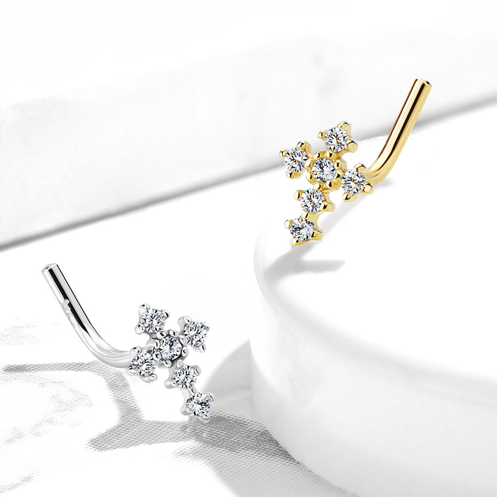 Tegemist on tõeliselt ilusa ninaneediga, alustades ehte värvist ja elegantsest ristikesest ning lõpetades nurga all olevast needivardast. Lisaks ilule on ehe ka suurepärase kvaliteediga ning valmistatud 14-karaadisest kullast. Teil on võimalik valida klassikalise kuldse ja laheda valgest kullast ehte vahel. Ehte needivarras on 90 kraadise nurga all, mis esitleb ehte kandjale tõelist mugavust, sest needi varras ei torgi kandja nina vaheseina, seda on meeletult mugav paigaldada ning ehe ei loksu ninast mitte kuidagi välja.