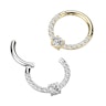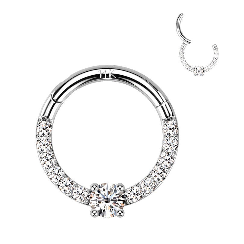 Selles elegantses 14K kullast rõngas on palju sädelust, millel on prongidega paigaldatud keskne kivi ja kividega ääristatud küljed. Selged CZ-kivid kaunistavad rõnga esikülge, mis teeb sellest tõeliselt pilkupüüdva eseme teie septumi või kõrvaaugustuse, näiteks helixi või daithi jaoks. Sõrmus on saadaval stiilsetes valge kulla ja klassikalise kollase kulla variatsioonides ning saate valida 8 mm või 10 mm sõrmuse läbimõõdu vahel.
