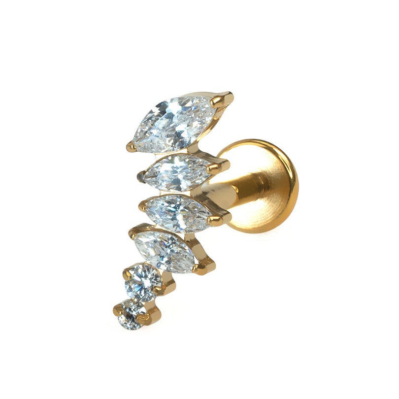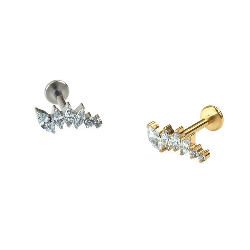 Sellel labretil on markiisilõikega tsirkooniumi kivikesed kahanevates suurustes, paigutatud kaares, mis sobivad ideaalselt helix, flat või ülemise kõrvanibu neetidesse, kus kaar jälgib sinu kõrva kuju. Ehe on sisekeermega, mis tähendab, et selle kandmiseks sisesta sile vars läbi oma needi ja keera ülaosa peale kinni. Valmistatud titaanist, on see ehe sobilik ka tundlikule nahale.
