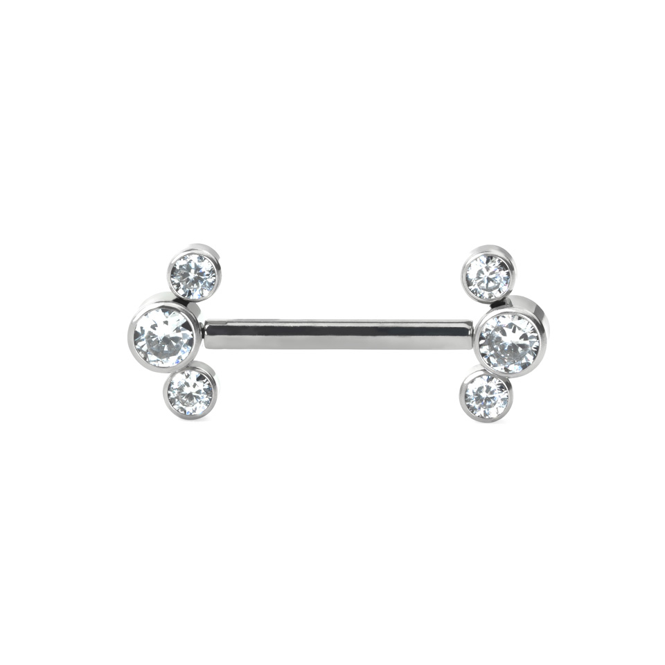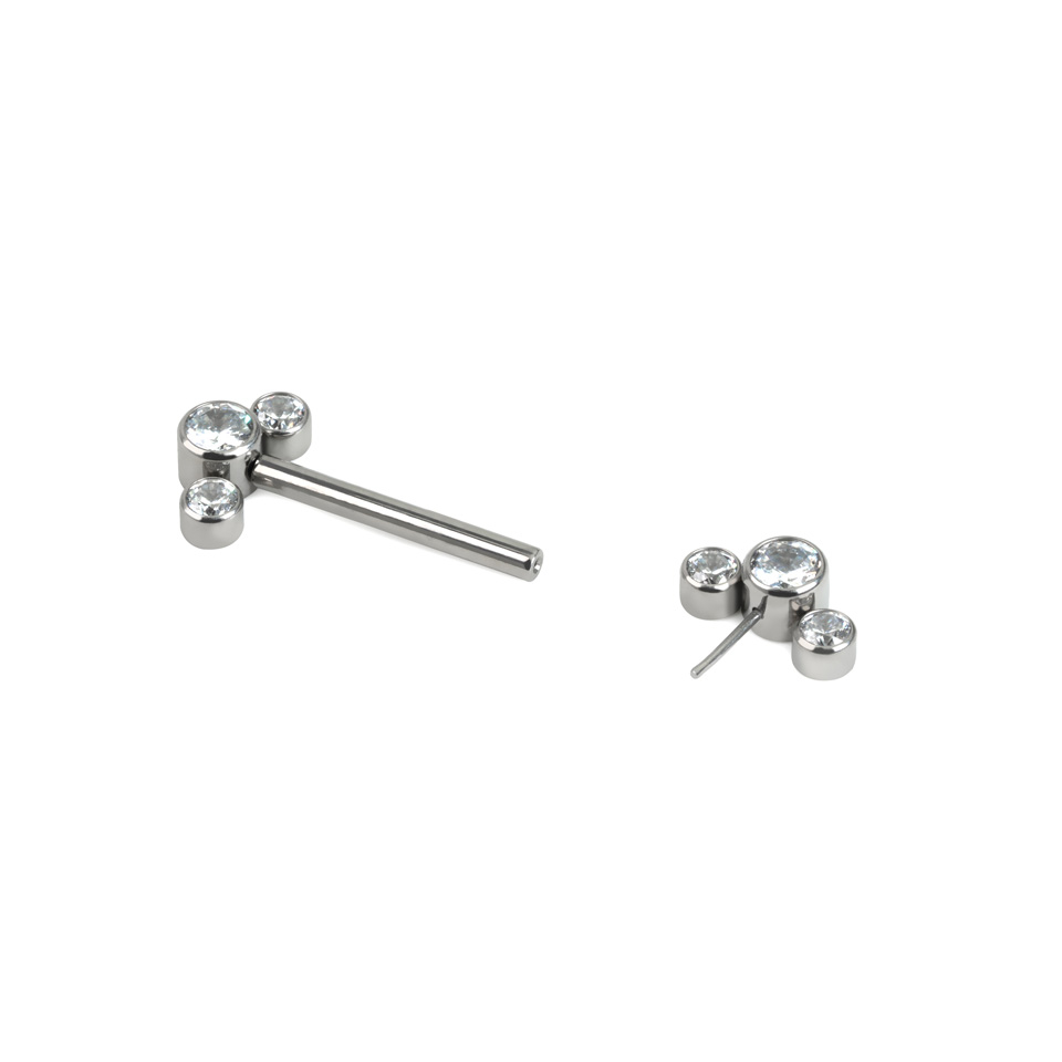 See barbell on valmistatud tiaanist, üks parimaid materjale, mida saad oma nibudele pakkuda. Läbipaistvad kiviksed mõlemas otsas on valmistatud kuubik tsirkoonidest metallis. Suurem on 3,9 mm ja väiksemad on 2,9 mm. Samuti on sel võimalik valida erinevate kivikeste värvi vahel.