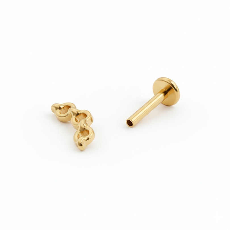 Saadaval kuldse või hõbeda viimistlusega, keti disain lisab ärevust ilma liialdamata. Valmistatud ASTM F136 titaanist on see allergiavaba, veekindel ja kestab õige hooldusega kogu elu. Sisekeermega on ehe sisestamisel ärrituse-vaba ning kindlalt kinnitatud.