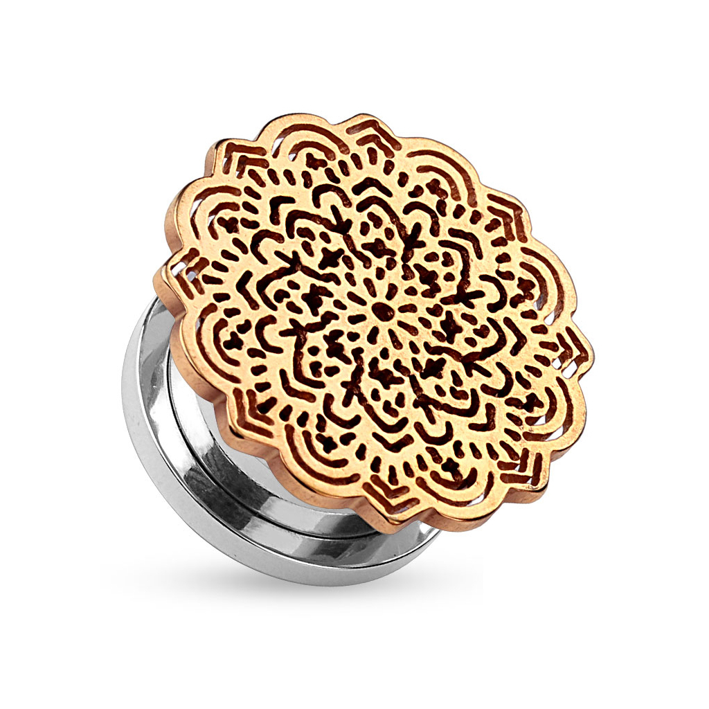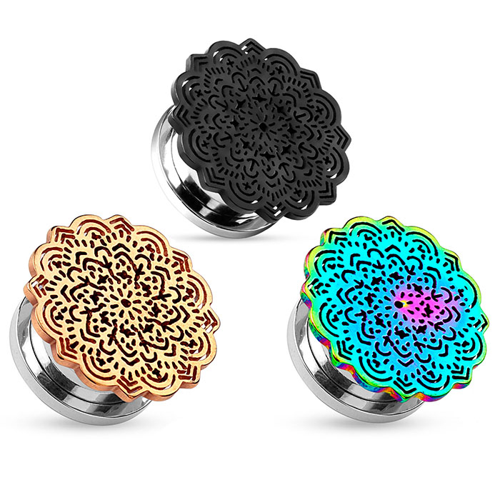 Siin sa võid tellida kauni ning detailse mandala erinevates värvitoonides, mis lisab veidi ekstra viimistlust niigi elegantsele ning armsale kujundusele. Ehte põhiosa on tehtud kirurgilisest terasest, sel ajal kui tagumine ots on keermestatud - sa võid selle lahti võtta, et tunnel lihtsamini kõrva sisse panna.