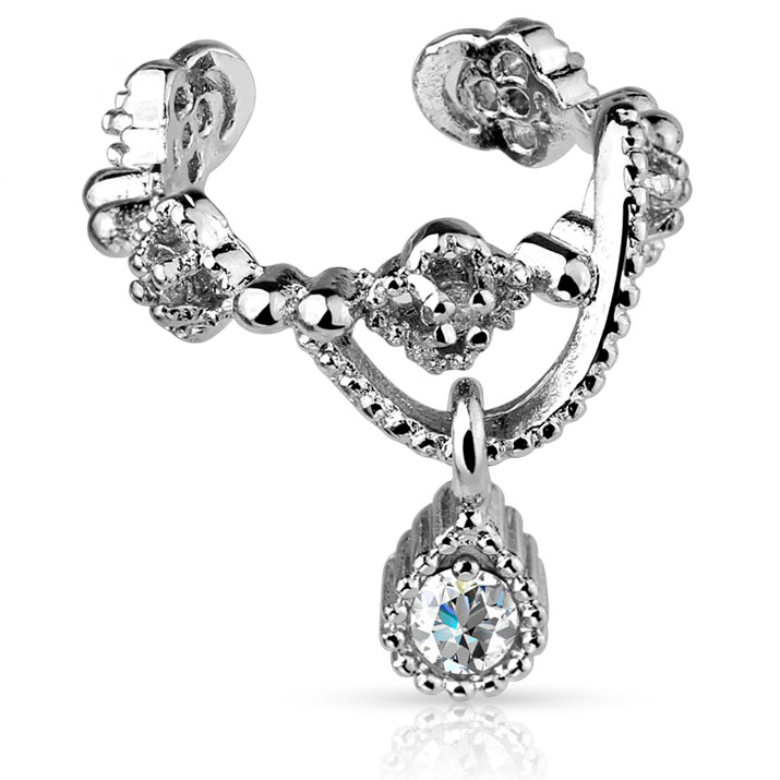Turul ei ole palju rippuvate osadega kõrvamansette; see, mis sinu ees on, on erakordne teos. Ripats on tilgakujuline; see näeb välja, nagu langeks sinu kõrvast pisaratera! Ripatsi keskel on ümmargune, kristalli värvi kivi. Kivi on nikerdatud tuntud teemantlõikega, nii et see suudab peegeldada valgust. See särav peegel-efekt on nii väikese manseti puhul suurepärane, mis on vääriline igale printsessile.