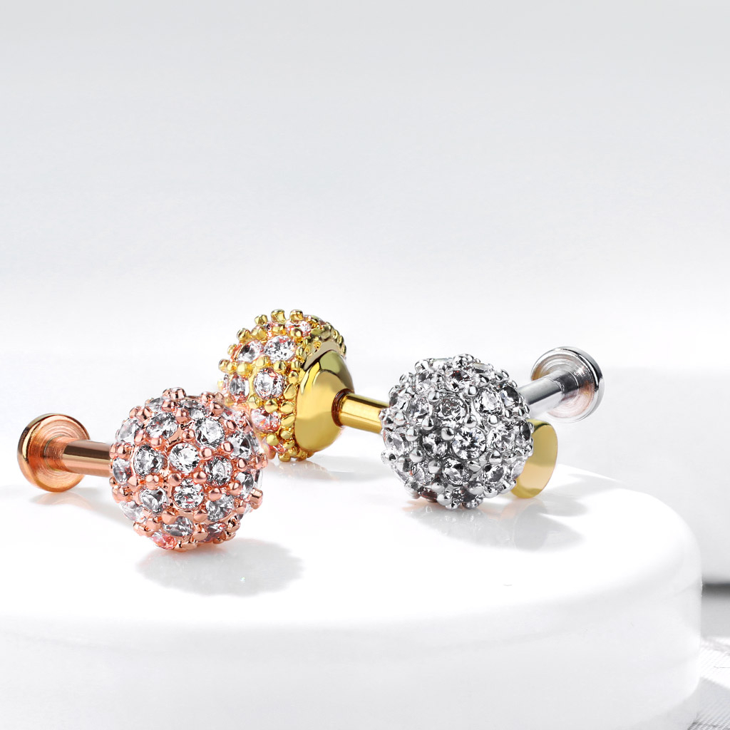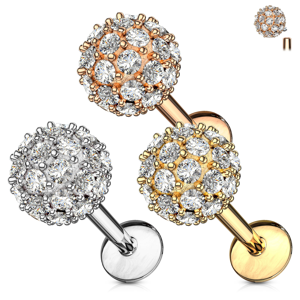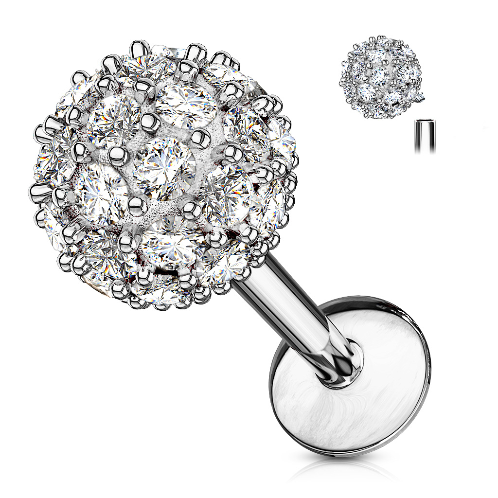 Ehe, mida siin näed on kaunistatud suure 6 mm diameetri suuruse kuuliga, mis on kaetud maagiliselt säravate kivikestega. Ehe ei jää kindlasti märkamatuks kellelegi. Labreti needi osa on valmistatud kirurgilisest terasest ja kuulike messingist. Lisaks on ehe kaetud erinevate värvitoonidega, et lisada ehtele omapära. Näiteks kui valid kuldse ehte, on neet kaetud 14-karaadise kullaga.