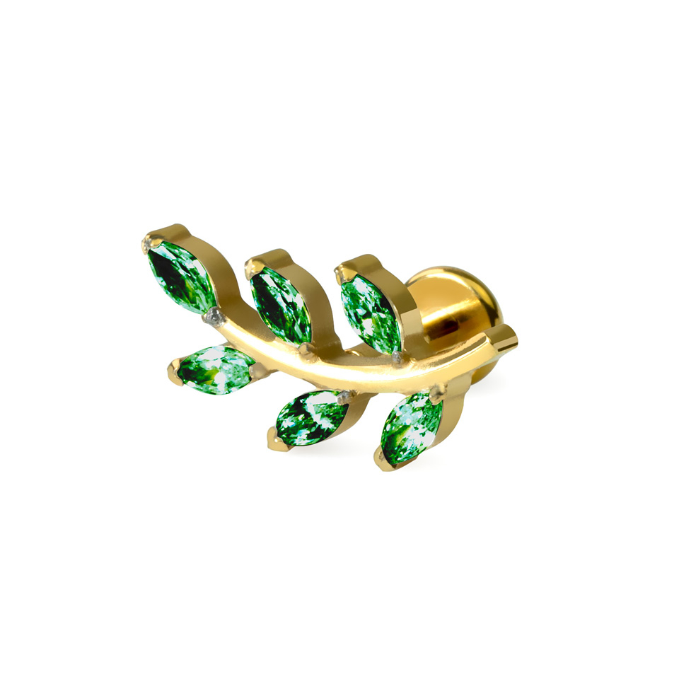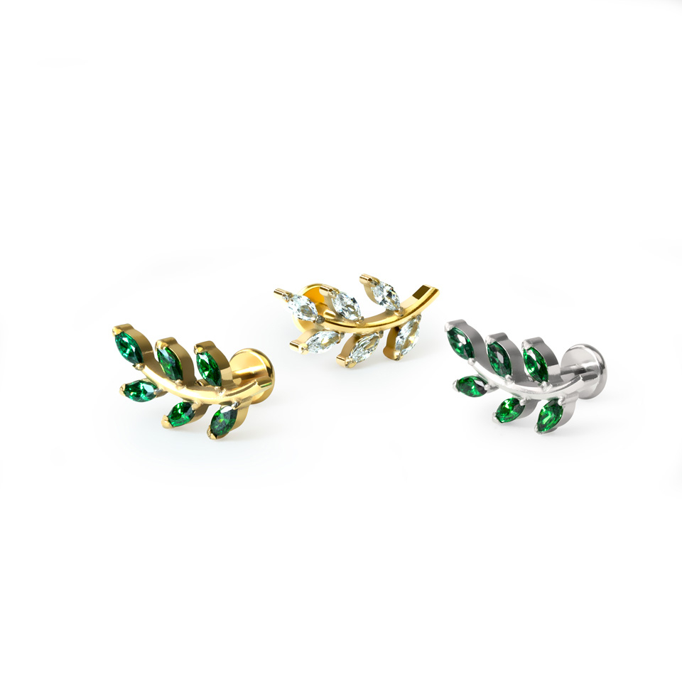 Kaunis premium lehekese kujuga labret, millel on 6 õrna markiisilõikega kivikest. Saadaval moodsate roheliste või klassikaliste läbipaistvate kivikestega ning kuldse või hõbeda viimistlusena, see ehe on väga stiilne lisand sinu kõrvakujundusele.