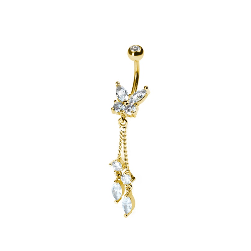 Sädeleva nabaneedi alumisel kuulil on kaunis liblikas ning ripatsite küljes veel enam säravaid kivikesi, mis ripuvad liblika küljes õrnade kettidega.