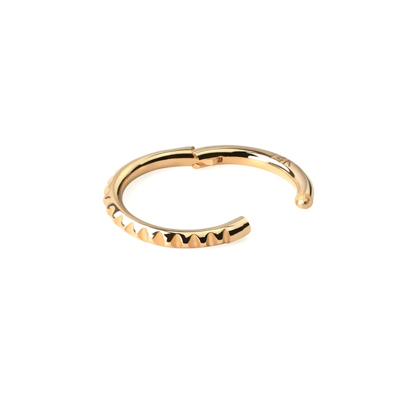 See rõngas on 1,2 mm paksusega, mis on standardne suurus nõelaga tehtud huule- ja kõrvaaukude jaoks. Rõngas on hingega, mis on oma praktilisuse tõttu muutunud üha populaarsemaks. Liigendiga rõngad avanevad kergesti, tõmmates hingesegmenti üles ja sulguvad vajutades segmenti alla, kuni see klõpsatab. Stiilne püramiidimuster teeb sellest rõngast tõelise pilkupüüdva eseme, mida saab lisada oma kõrvaneetide kombinatsiooni.