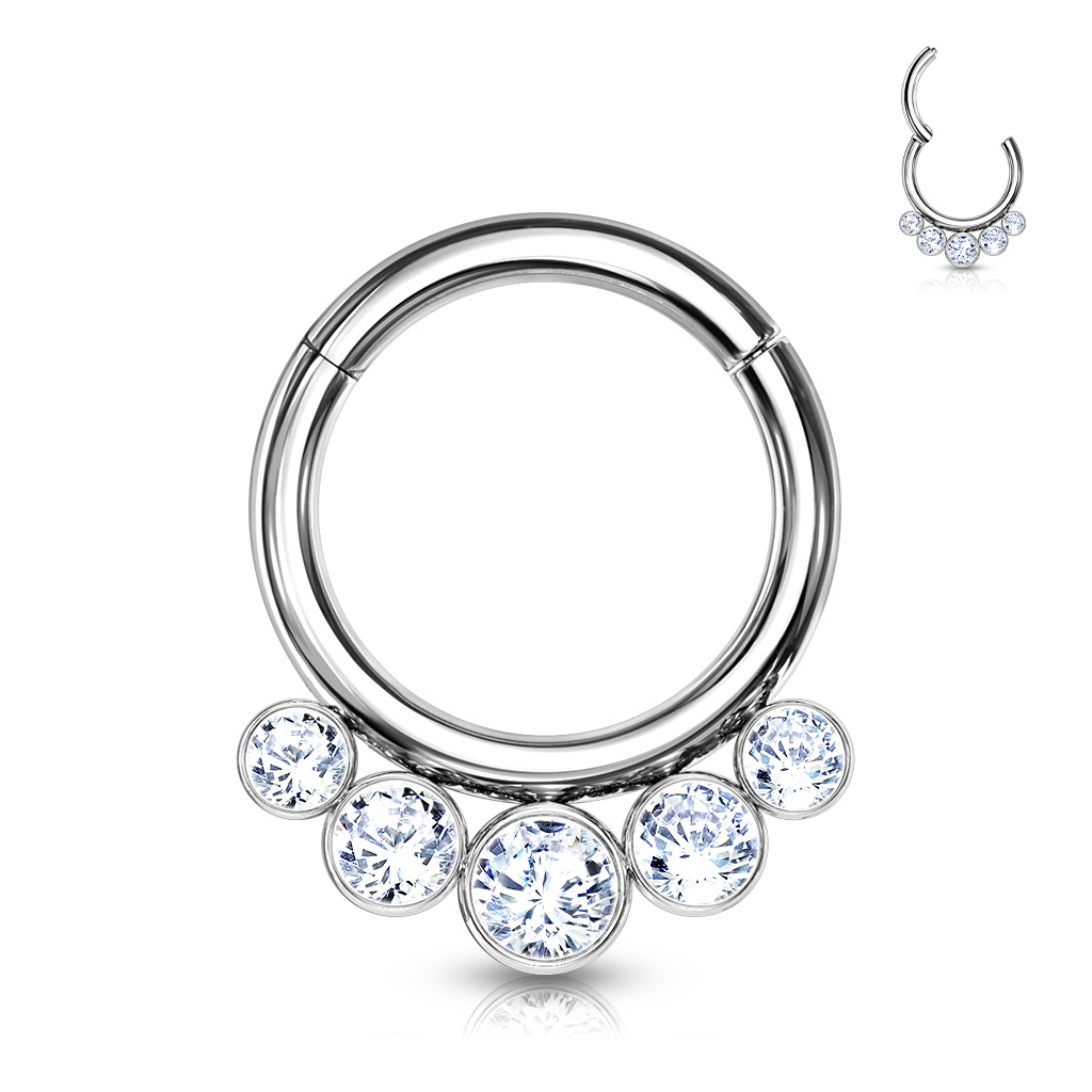 See rõngas on valmistatud titaanist, mis on üks parimaid materjale, mida sa saad oma augustusele pakkuda. Seepärast kasutatakse seda ka esmase needina värske neediaugu jaoks. Rõnga gabariit ehk paksus on 1,2 mm ja see on saadaval läbimõõduga 8 mm ja 10 mm. Olenemata sellest, millise läbimõõdu sa valid, on rõnga allosas viis kivi. Keskel olev kivi on suurim ja kivid muutuvad otste poole järjest väiksemaks, nagu kaardus kobaras.
