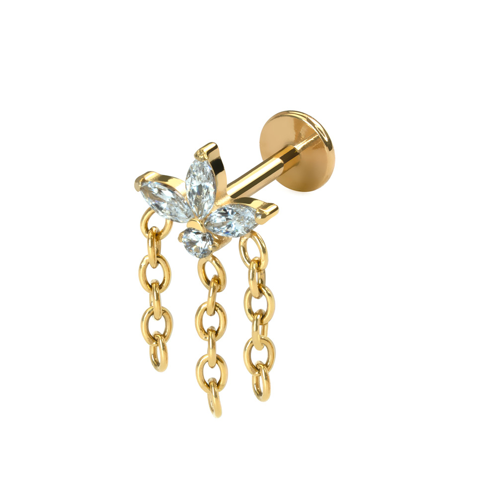 Sellel unikaalsel labretil on 4 tsirkooniumi kivikest: kolm on markiisilõikega paigutatud ühtlaselt ümber väiksema ümmarguse kivi, mis tekitab lille kuju. Iga kolme kivi küljest ripub õrn ketiga ripats. See ehe on push-in mehhanismiga, mis tähendab, et ehte neeti sisestamiseks lihtsalt libistad varda läbi augu ja lükkad pealmise osa vardasse. Valmistatud titaanist, sobib ehe ka tundlikule nahale. Tänu delikaatsele suurusele sobib ehe erinevatesse kõrvaneetidesse, sh flat, tragus ja kõrvalesta needid.