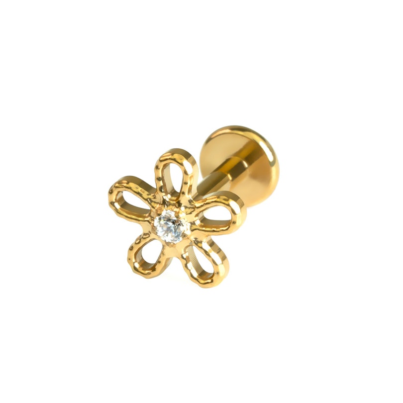Meie rõõmsa karikakra kujuga labreti keskmeks on õrna säraga tsirkooniumi kivi. Sisekeermega varrast on lihtne kanda: lihtsalt libista sile needivarras läbi oma augustuse ja keera ülaosa vardasse kinni. Valmistatud allergiavabast titaanist, see ehe on ideaalne tundlikule nahale. Saadaval kuldse ja hõbeda viimistulsena ning saad valida varda pikkuse, mis sulle sobib. Lisa oma välimusele vunki juurde selle armsa karikakra disainiga.