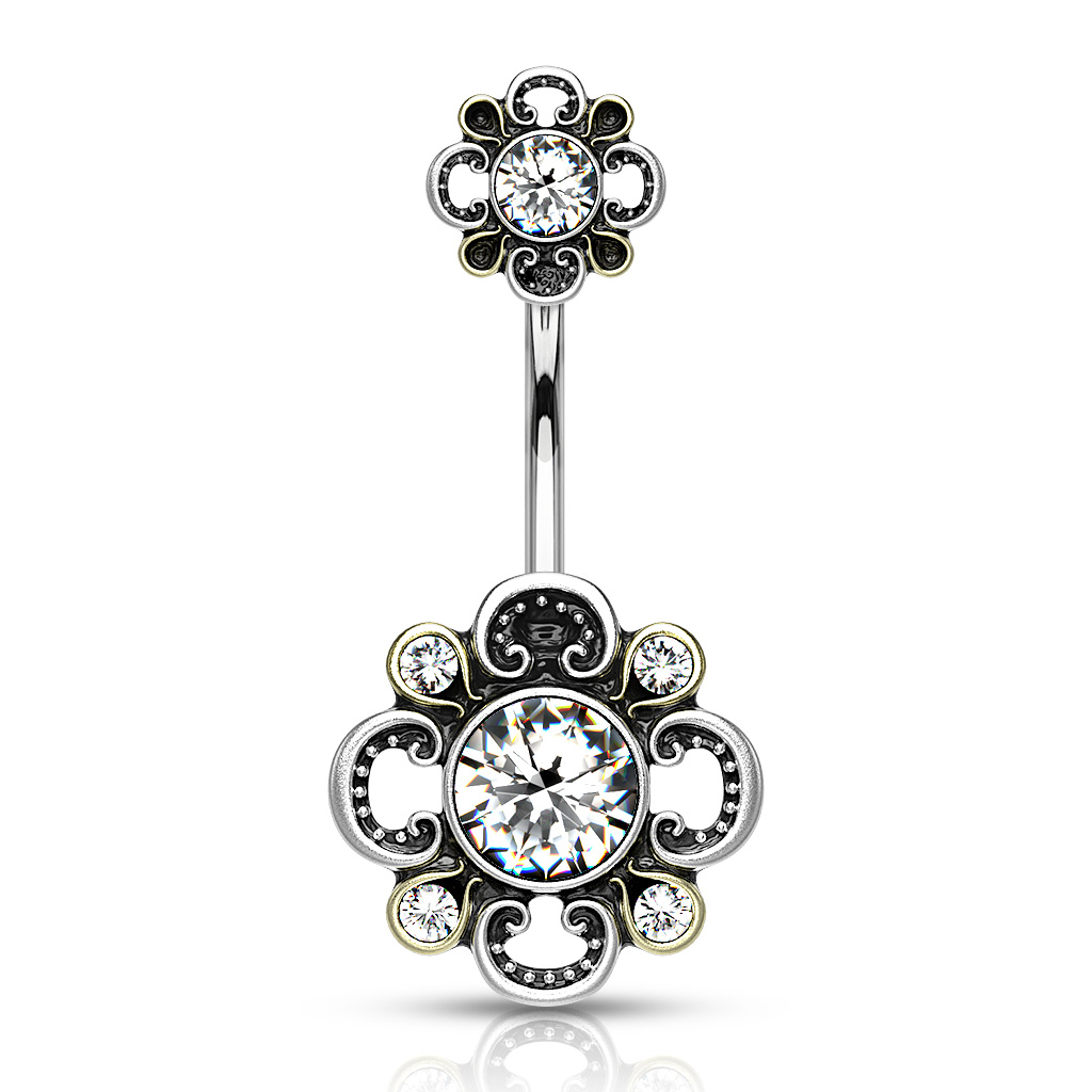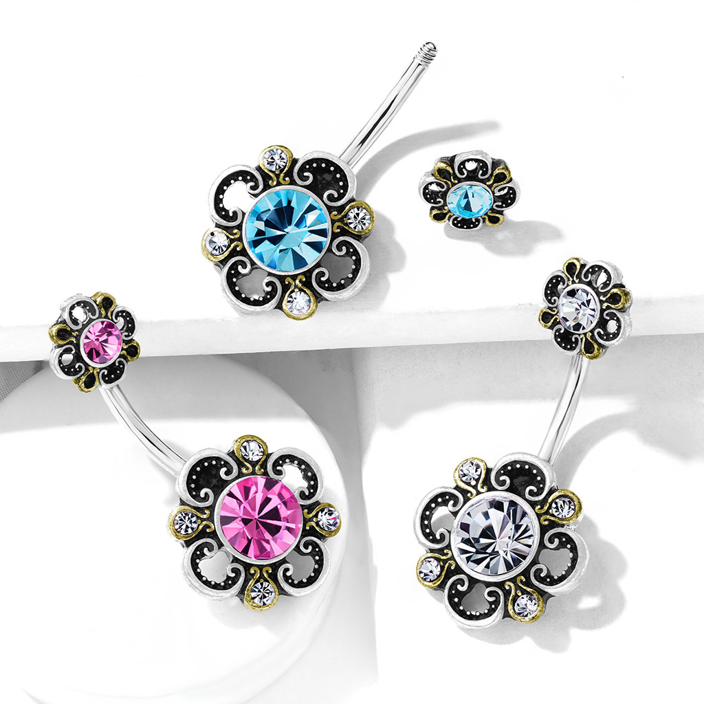 Sellel ehtel on mitu ilusat kivikest, mis on kinnitatud needivarda nii ülemisele kui sa alumisele otsale. Üleval ja all olevate suurte kivikeste värvi sa saad valida ise - näiteks on olemas roosa värvivariant. Lisaks on sellel ehtel veel neli väikest ümmargust kivi, mis kaunistavad all oleva lillekese õisi. Need jäävad alati värvitult klaariks sõltumata sellest, mis värvi sa valid suurte kivide jaoks. Aga ole rahulik - need klaarid kivid sobivad ilusti kokku kõikide suurte kivide värvivariantidega.