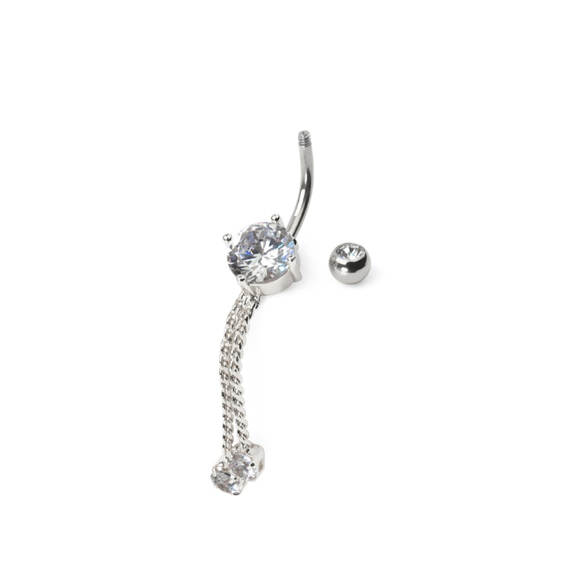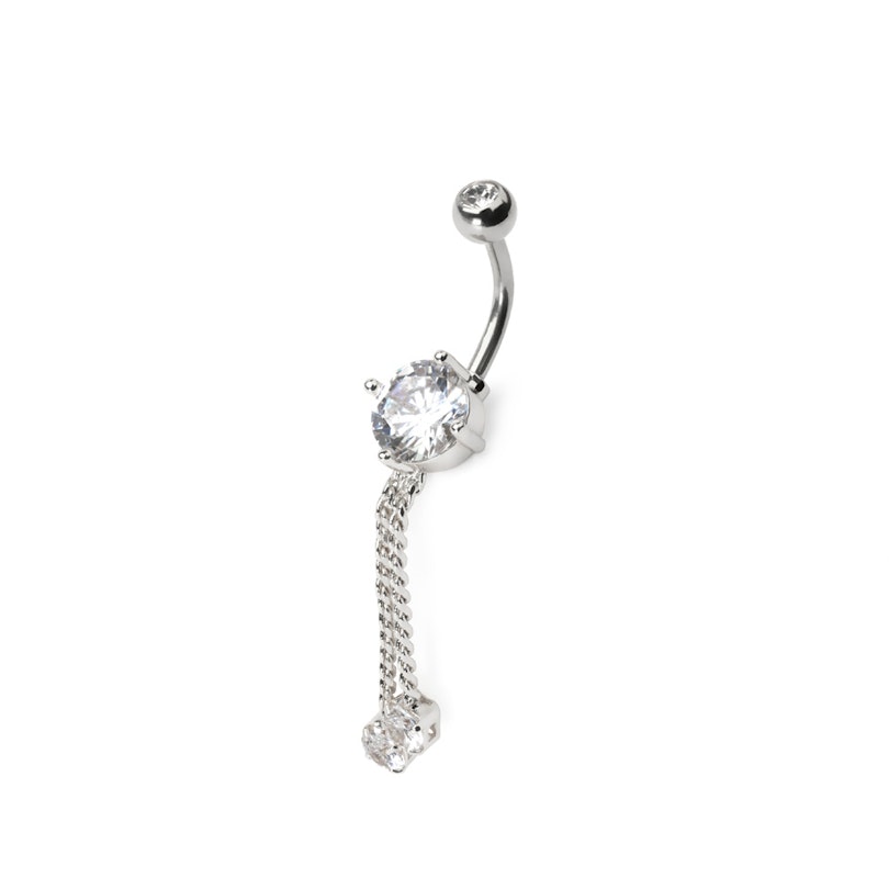 See kaunis nabaneet on tõeline statement ehe. Väikeste kividega viimistletud ketid lisavad elegantsust ja liikuvust, muutes selle nabaneedi tõeliselt ainulaadseks. Kirurgilisest terasest materjal tagab vastupidavuse ja mugavuse. Varras on 10 mm pikk ja varda paksus on 1,6 mm. Kett ripub 28 mm kaugusel põhikivist. Valikus on kullast, hõbedast ja roosakullast viimistlused läbipaistvate kividega. See nabaneet on ideaalne aksessuaar, et lisada oma välimusele sära.