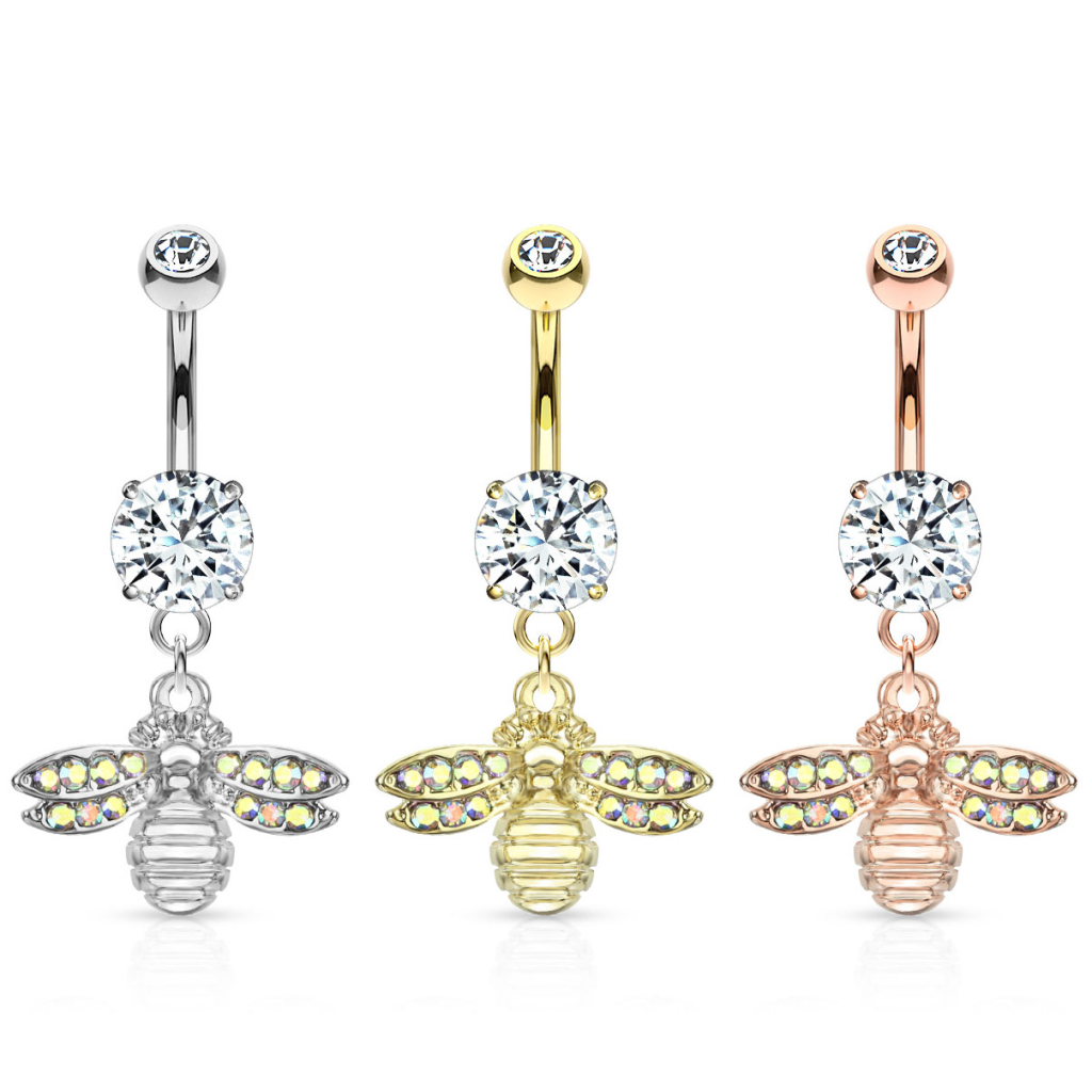 Ülaltoodud nabaneedil on ripatsiks armas väike mesilane. Mesilane on valmistatud messingist ja tema tiivad sisaldavad mitmeid pisikesi kive, mis peegeldavad enamikku vikerkaarevärve. Me nimetame seda virmalisteks, sest see meenutab põhjamaist valgust. Mesilane ripub 10 mm pikkusel kaardus vardal, mille jämedus on 1,6 mm. See on valmistatud kirurgilisest terasest, nagu enamik teisi nabaneete, mida poest leiad.