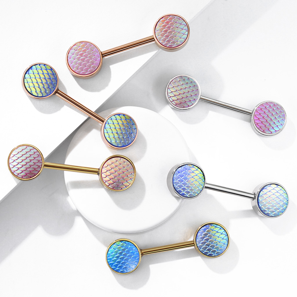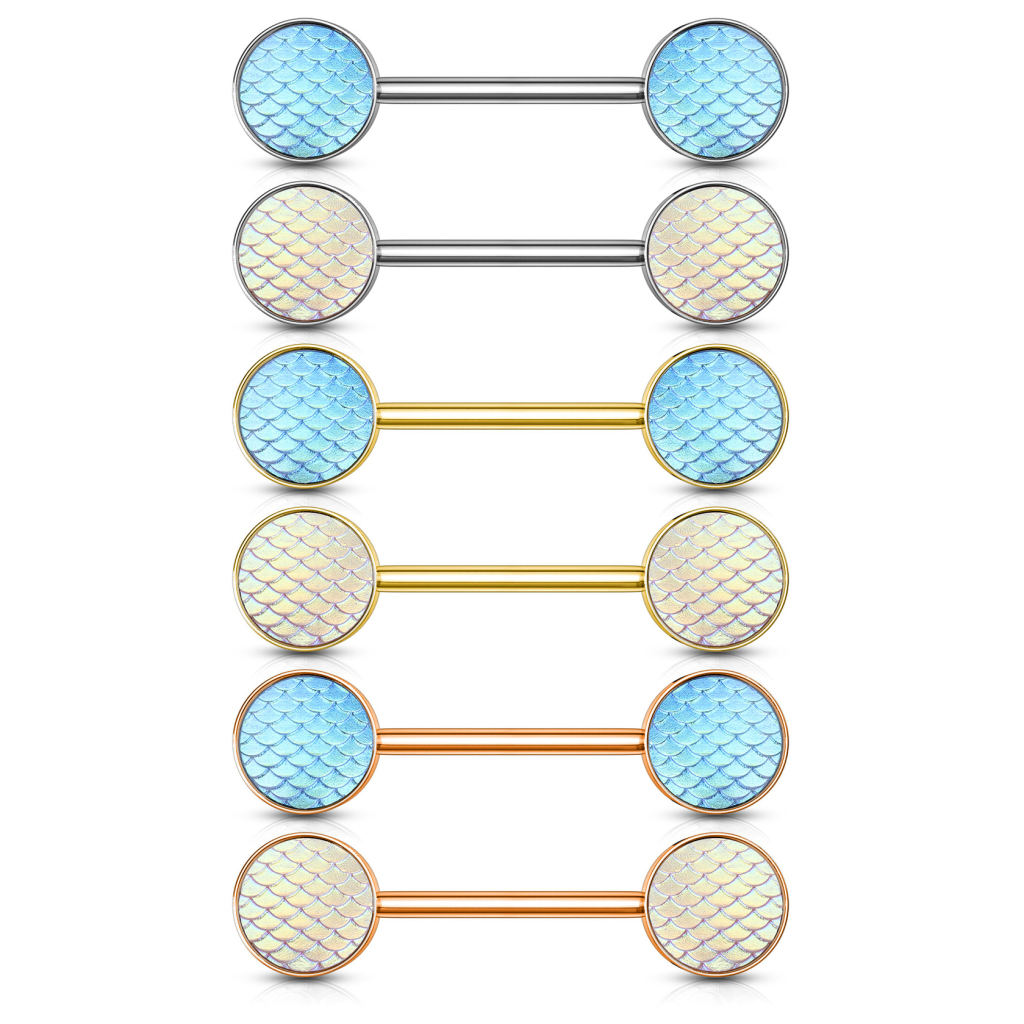 Antud needi kaunistused on valmistatud moel, mis loob soomuselise pinna. Lisaks on needi kaunistused loodud värvitoonides, mis lisavad ehtele vaid efekti juurde, sest värvitoonid on nüansse muutvad. Teil on võimalik valida näiteks roosakat tooni needi ehte ja sinaka neediehte vahel. Needi metalne osa on valmistatud kirurgilisest terasest. Ning ka siinkohal on teil võimalik valida erinevate värvitoonide vahel - miks mitte punane kuld või kõige tavapärasem hõbedane värvitoon.