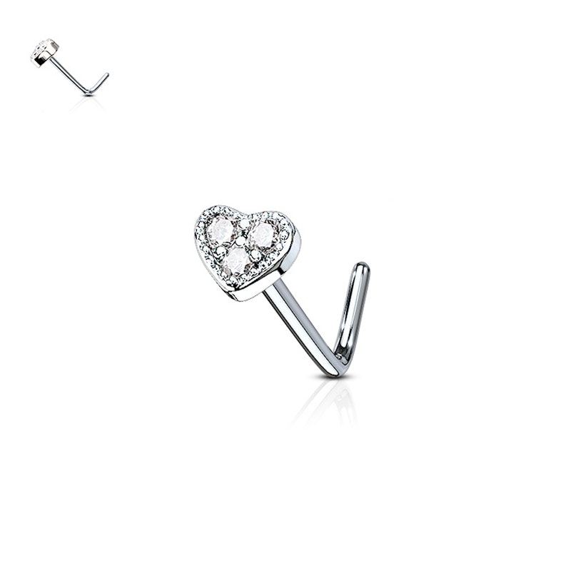 See kaunis ehe on oma disainilt "L" tähte meenutava kujuga. See disainilahendus aitab ehtel turvaliselt püsida teie nina augustuses ning te ei pea muretsema, et ehe vastu teie nina vaheseina hõõruks. Ehet kaunistab armas süda, millel asetsevad pisikesed kivikesed, mille värvitooni on teil võimalik ise valida. Lisaks on teil võimalik valida ka ehte kaunistuse konstruktsiooni värvust.