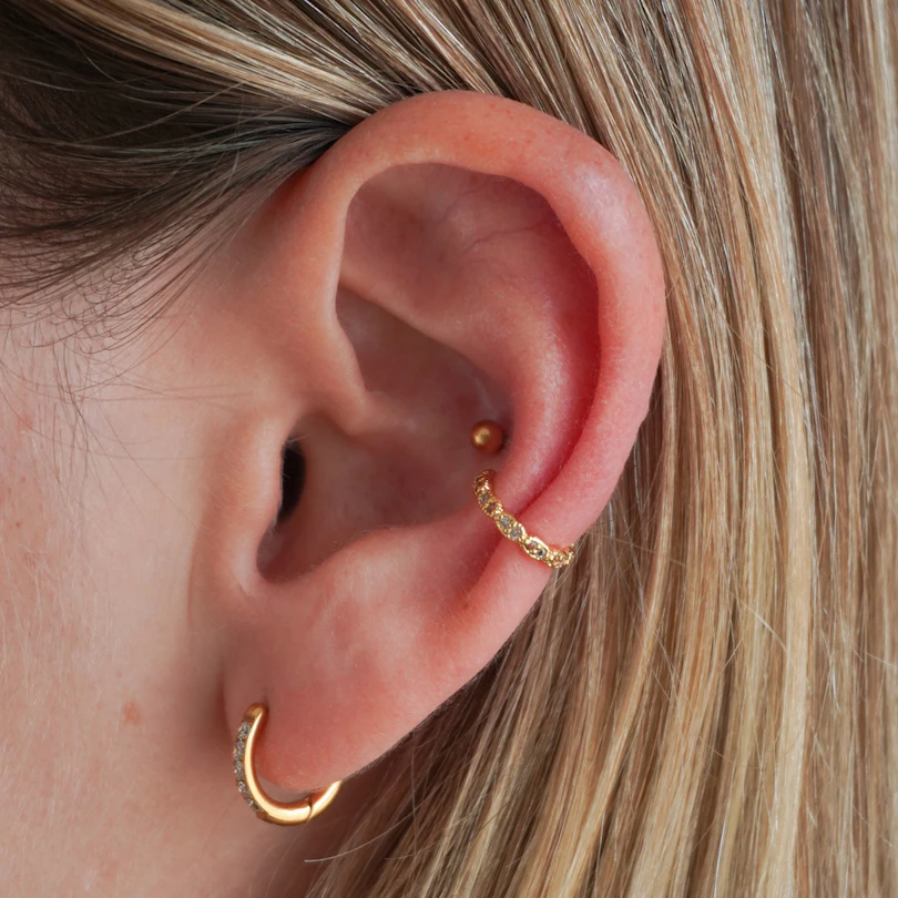 Valmistatud kullatud messingist, sobib see enamik nahatüüpidele ja on loodud igapäevaseks kandmiseks. Pritsmekindel, vastupidav ja lihtne kasutada, see kõrvamansett on kiire viis stiili värskendamiseks ilma püsiva kohustuseta.