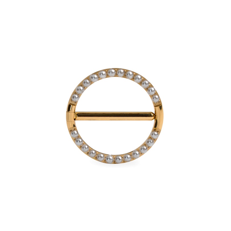 Pärlitega kaunistatud titaanist nibuklikker tõestab, et pärlid pole vaid kaelakeedele. Täisringis prongidega kinnitatud pärlid kuldse või hõbeda viimistlusena raamivad sinu neeti ja lisavad sellele veidi särtsu.