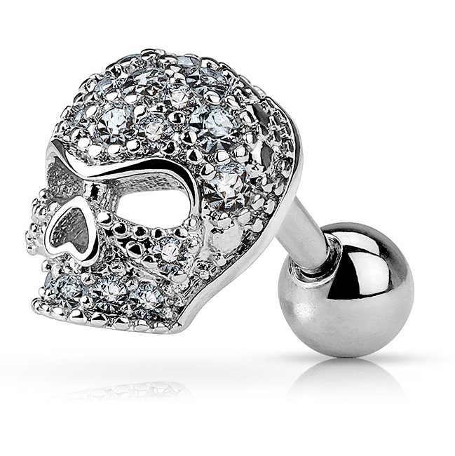 Nagu näed ka pildilt, on sellel kõrvaneedil keermetega kuul, mille saab needivarda otsa kruvida. Pealuul on palju värvituid mikrokivikesi. mis panevad selle valguse käes särama. Varras ja kuul on valmistatud kirurgilisest terasest ning pealuu on messingust. Parem oleks, et keegi sinu pealuu neediga ei jamaks, sest see näeb kuri välja!