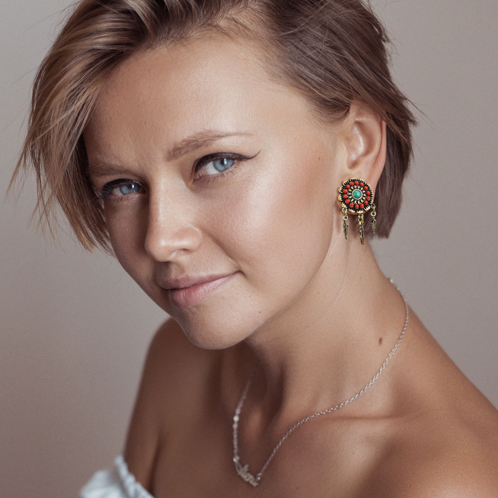 Sellel plugil on lillele sarnanev dekoratiivne esikülg. Lille keskel on türkiisne akrüülist helmes, mis sobib kenasti kokku seda ümbritsevate helmestega. Plugi äärtel on väikestest lehekestest raamike, mis teeb lille väljapaistvaks. Ehtel pole mitte ainult paljude pisidetailidega lill, vaid ka kolm vabalt rippuvalt sulge, mis liiguvad sinu keha liigutustega kaasa.