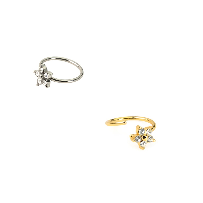 Sellel elegantsel kirurgilisest terasest rõngal on peen lill, mis koosneb viiest kalliskivi kroonlehest keskse helme ümber. Rõngas on saadaval kuldse või hõbedase viimistlusega ning on valmistatud kirurgilisest terasest, nii et see on tugev ja vastupidav ega tuhmu. See rõngas on peenike (0,8 mm/20 g) ja sobib ideaalselt ninaneeti, kuid ehet võib kanda ka helixis ja muudes kõrvaneetides. Lihtsalt keera rõngast avamiseks, sisesta ehe oma augustusse ja keera ehe kinni.