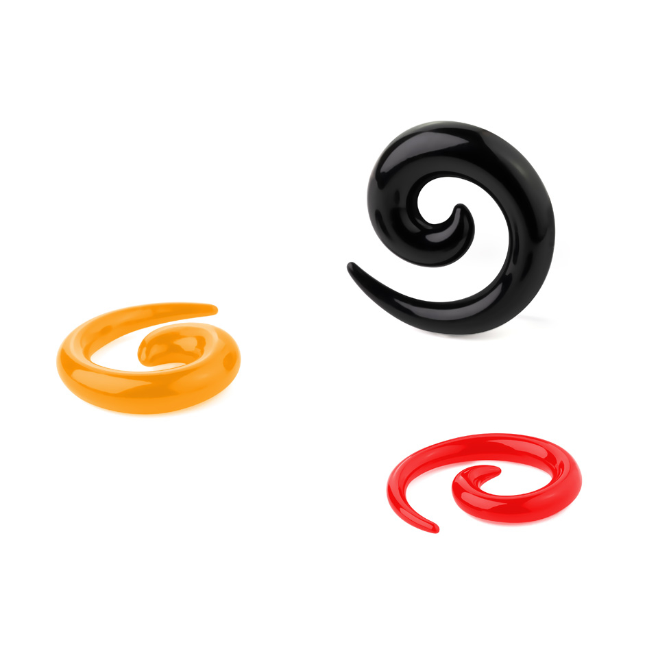 Need spiraalse kujuga koonusneedid siin on tehtud akrüülist, mis on ohutu materjal, kerge kaaluga ning allergiavaba. Spiraali kujuga venitaja sobib ka sulle, kes soovid kombineerida täielikku kontrolli funky väljanägemisega. Pane tähele, et musta, valget, roosat ning helesinist värvi koonusneedid on matjad, sel ajal kui teised on veidi läbipaistvamad.
