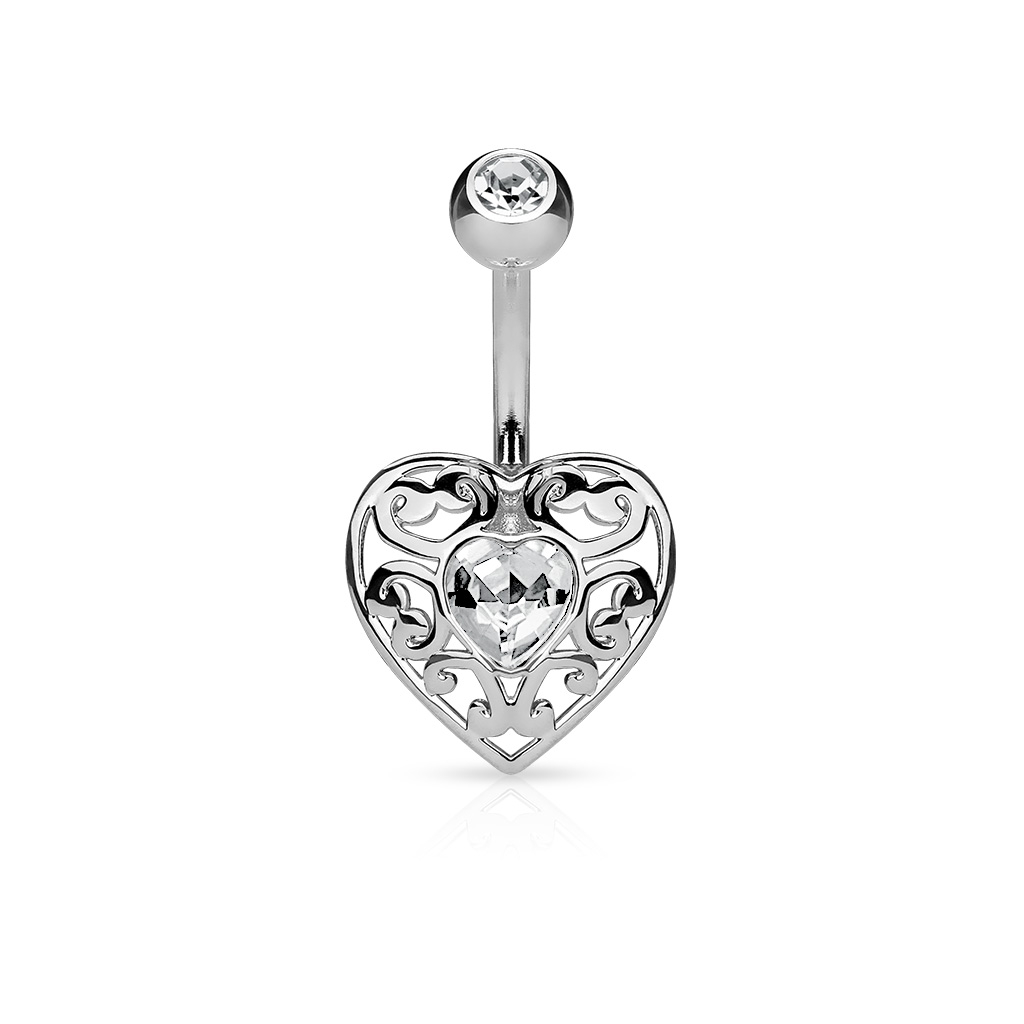 Alumine osa on messingist valmistatud süda ja sinu augustust läbiv kumer varras on valmistatud kirurgilisest terasest. Selle südame keskel on kivi, mis on samuti kujundatud südamekujuliselt, ja see on saadaval erinevates värvides, sõltuvalt sellest, millist tooni needi valid.