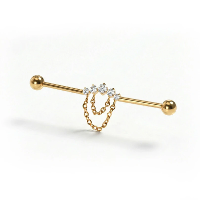 Titaanist industriaal barbell kivide ja kettidega lisab klassikalisele industriaal-kujule ekstra detaili. Vardal on väiksed kivikesed, mida ühendavad peened ketid, mis loovad kontrollitud ja kantava kihilise välimuse. See paistab silma, ent pole liialt silmatorkav ja sobib hästi, kui soovid oma ehetekombos väikseid muudatusi. Saadaval kuldses ja hõbedas toonis.