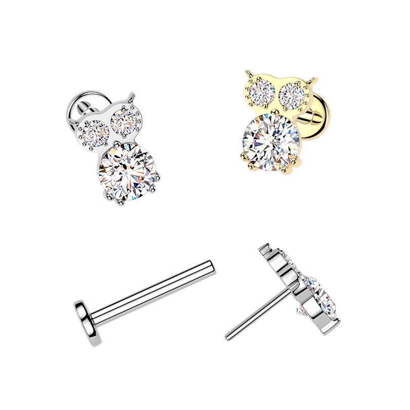 Titaanist kividega öökulliga labret lisab sinu ehete kombole natuke iseloomu. Öökulli kuju on detailne mitme kiviga, kinnitatud prongidega, mis annavad tekstuuri ilma üle liialdamata. Saadaval kuldses ja hõbedas toonis, sobib see eriti siis, kui soovid midagi vormikat ja väljendusrikast, mitte minimalistlikku.