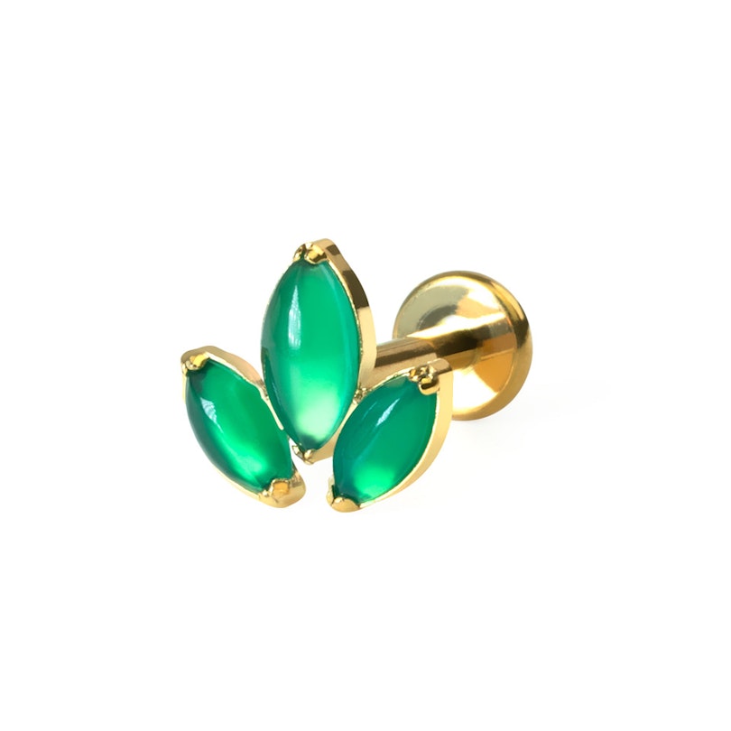 Sellel stiilsel labretil on 3 markiisilõikega rohelist kivi, mis on lootoslille kujundusega.