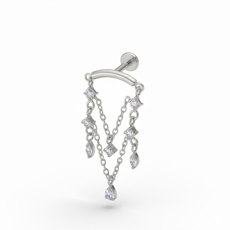 Titaanist labret lühtrist ripatsiga on loodud liikuvuseks. Väiksed kivikestega tilgad ripuvad labretist, lisades õrna liikuvust, mida märkad, kui keerad pead. Ehe on pidulik ilma üle pingutamata ja sobib, kui soovid igapäevase ehete kombo asemel midagi teistsugust. Saadaval kuldses ja hõbedas toonis.