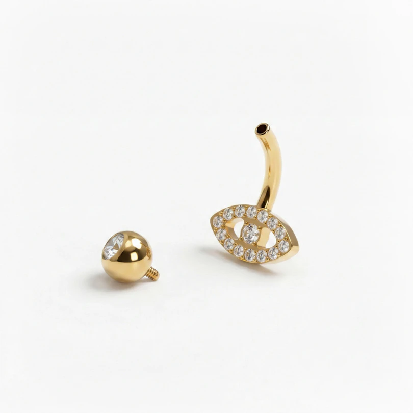 Titaanist kurja silmaga nabarõngas lisab su nabaneedile sümboolse nüansi. Silmamotiiv on täpselt keskel, mille ümber on väiksed kivikesed, mis annavad kujule selgust. See on peenelt väljendusrikas, lihtne kanda ja sobib sama hästi nii tšillidel päevadel kui ka siis, kui oled natuke stiilsem. Saadaval kuldses ja hõbedas toonis.