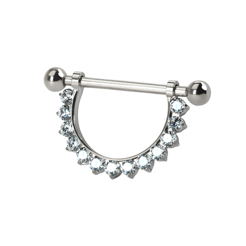 See imeline niburõngas on valmistatud implantaadikvaliteediga titaanist. Ehe koosneb lihtsast sisekeermega barbellist, mis läbib su augustust, mille külge on kinnitatud pimestav pavé asetusega tsirkoon kivikestest poolring, mis raamib kaunilt su nibu.
