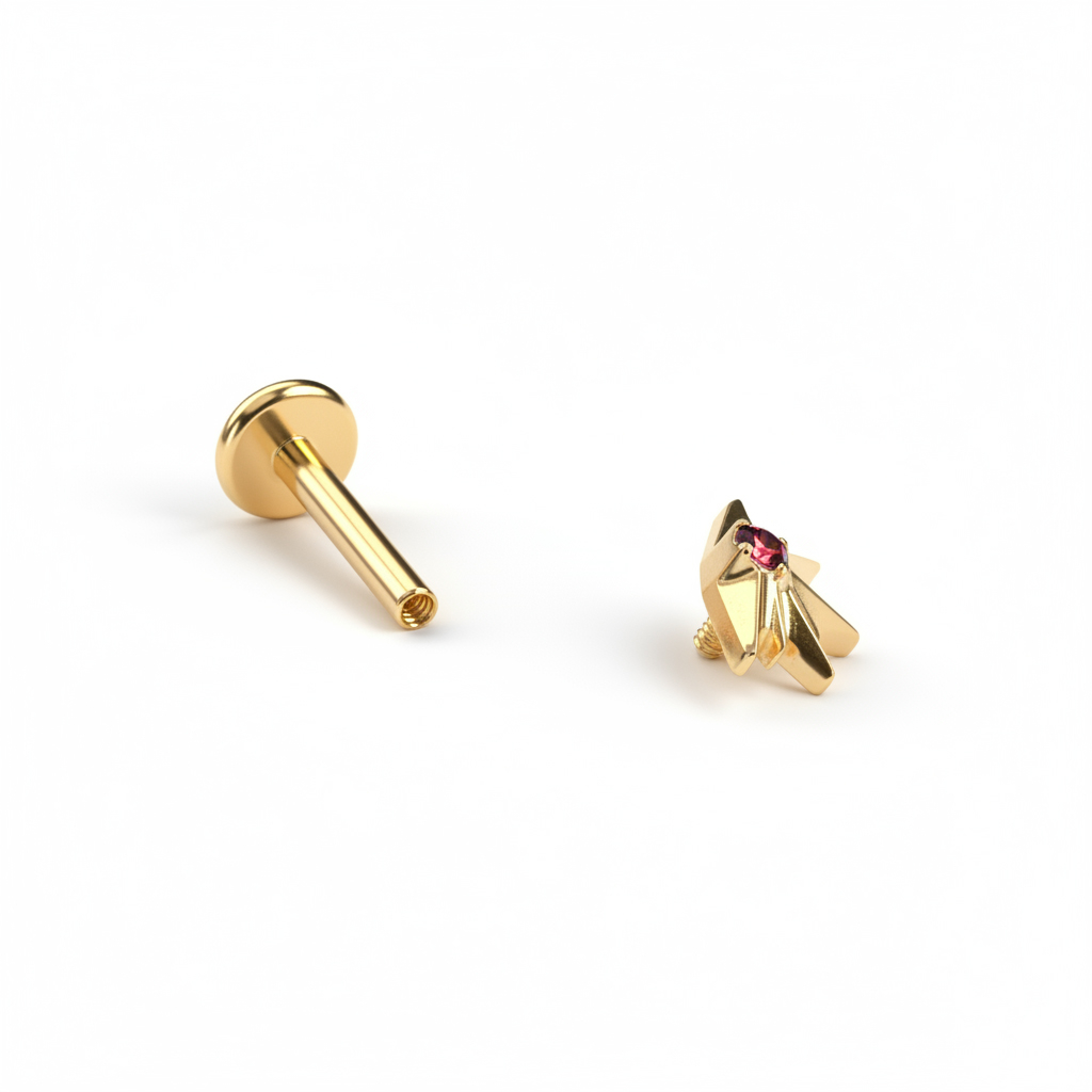 See titaanist päikeseloojangu labret on loodud hetkedeks, mis elavad meis edasi. Päikesekiirtega disain prongidega kinnitatud kiviga, mis on saadaval läbipaistvana või punases toonis. Kuldse või hõbeda viimistlusega, vahetub koos sinuga.