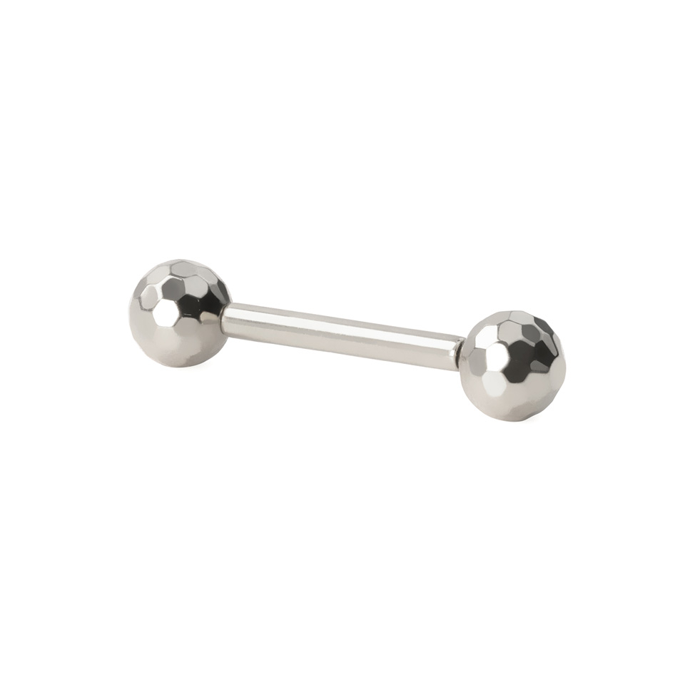 Selle titaanist barbelli otstes on mitmetahulised kuulid, mis näivad kui diskokuul. See ehe on keermeta või "push in", mis tähendab, et selle sisestamine on väga lihtne - lükkad lihtsalt mõlemad kuulid ehtesse, et need kinnitada. Seega pole ei teravaid otsi ega keerulisi kinnitusmehhanisme.