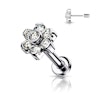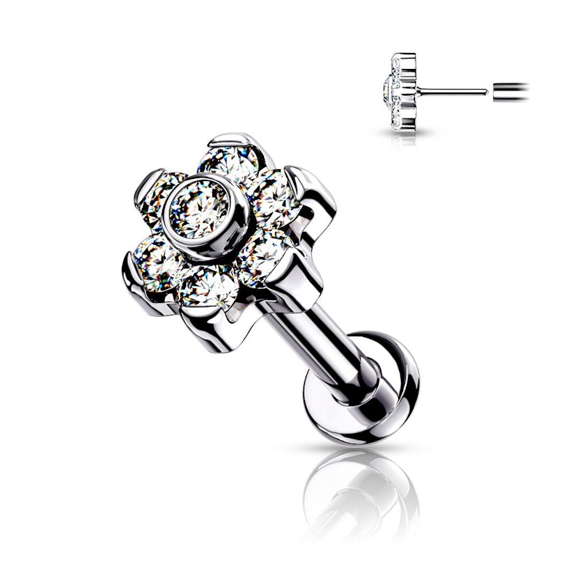 Labreti ülaosa koosneb seitsmest pisikesest kivist, mis koos moodustavad väikese lille -- ilusa lille, millel on kuus kroonlehte ja keskne kivi. Kivide värvi saad ise valida. Lille tagaküljele on paigaldatud väike nõel, mis toimib lukustajana. Saad nõela lihtsalt välja tõmmata, sisestada selle läbi oma needistuse ja seejärel suruda nõela uuesti varda sisse. Nõel istub pinge all varda sees. Kui sa paned seda mitu korda sisse ja välja, võib juhtuda, et see muutub aja jooksul lihtsamaks. Kuid ära muretse! Seda saab hõlpsasti parandada, kui paned ülemise poole varda sisse ja annad sellele kerge painutuse. See muudab nõela pinge vardas jälle tugevamaks.