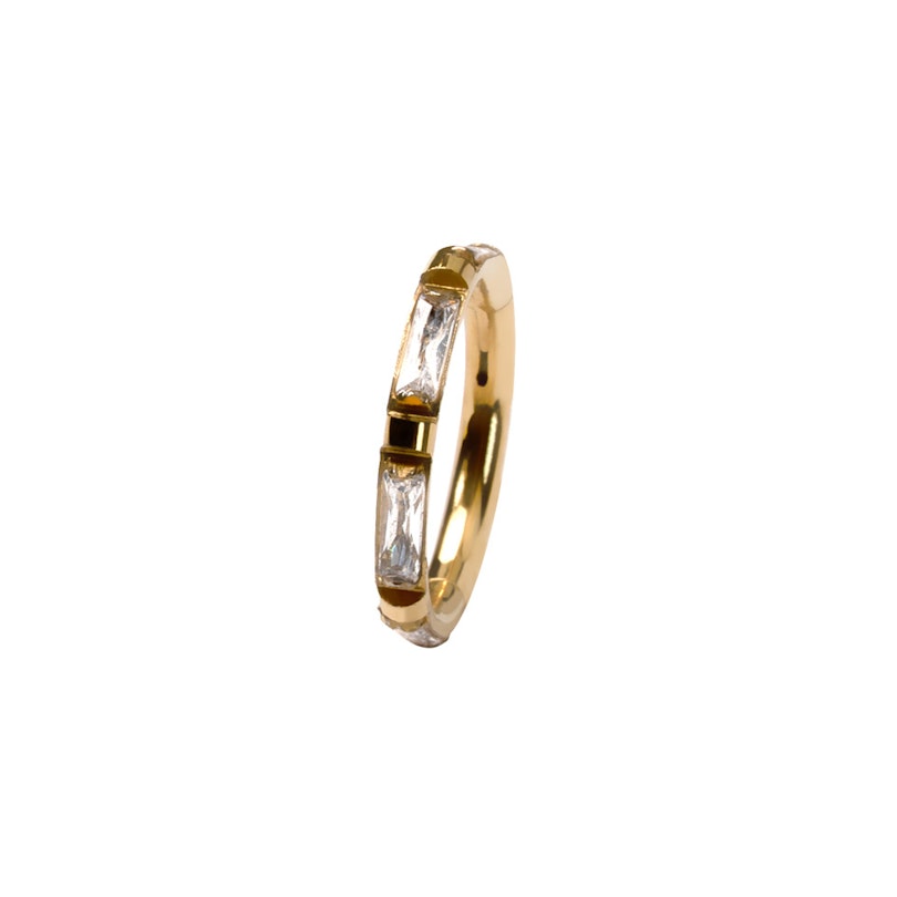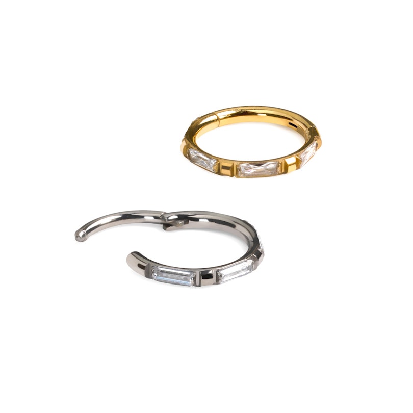 Sellel baguette lõikega kividega titaanist rõngal on stiilne disain, milles vahelduvad baguette lõikega ristkülikukujulised CZ kivid ja rõnga välisküljel olevad pisikesed metallruudud. See on liigendiga rõngas, nii et ehet on lihtne augustusse sisestada ja kinnitada. Valmistatud titaanist, on ehe allergiavaba, vastupidav ja veekindel.