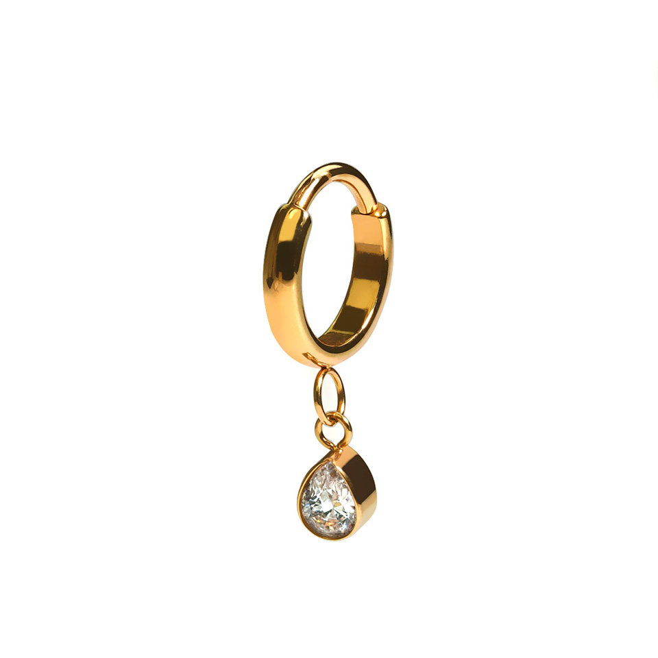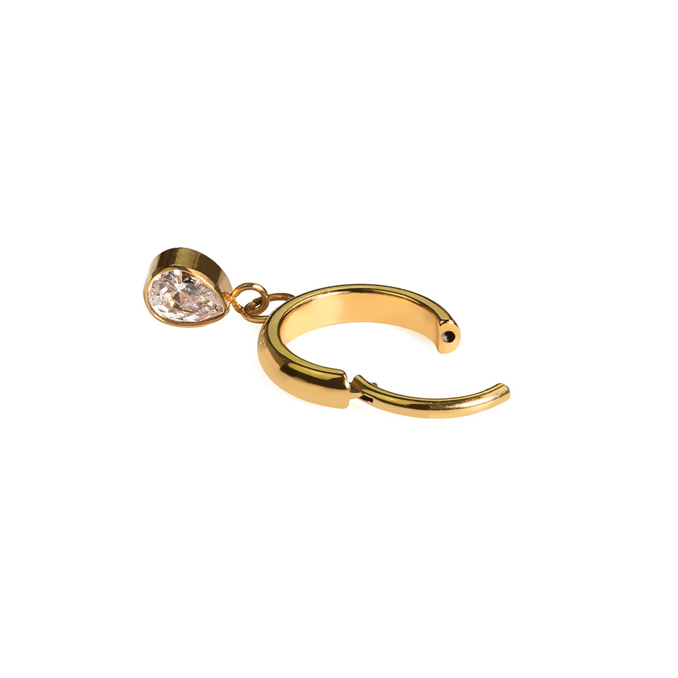 See stiilne rõngas on 2 mm lai ja kergelt kumer, va osa, mis läbib su augustust, mis on sinu valitud paksusega (1 mm või 1,2 mm). Ehtel on pisarakujuline raamitud (bezel-set) tsirkooniumi kivist ripats, mis ripub rõnga küljes kahe õrna aasaga. Pisar ise on 4,5 mm suurune.