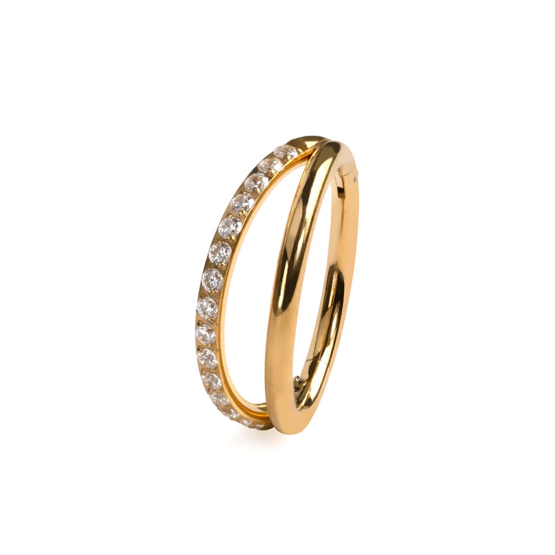 See Bodymod Trendsi titaanist topeltrõngas, mille ühel rõngal on kivikesed, on huvitava poolitatud disainiga: üks pool on sile ja minimaalne, teine kividega kaetud. Kaks meeleolu, üks rõngas.
