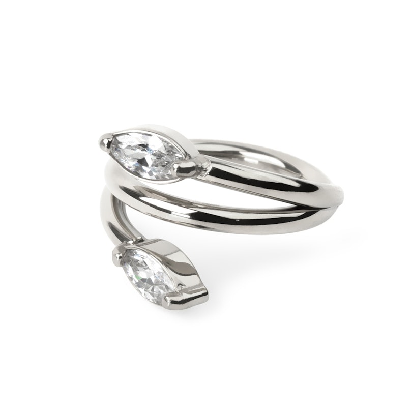 Kirurgilisest terasest õrn liigendiga rõngas. Sellel kaunil rõngal on kaks markiisilõikega tsirkoonium kivi, mis näevad välja nagu lehed viinapuu küljes. Saadaval 8 mm ja 10 mm läbimõõduga ning kuldse või hõbedase viimistlusega, see mitmekülgne ehe sobib suurepäraselt igasse kõrvaneeti, eriti kõhre, nagu näiteks rook ja helix.